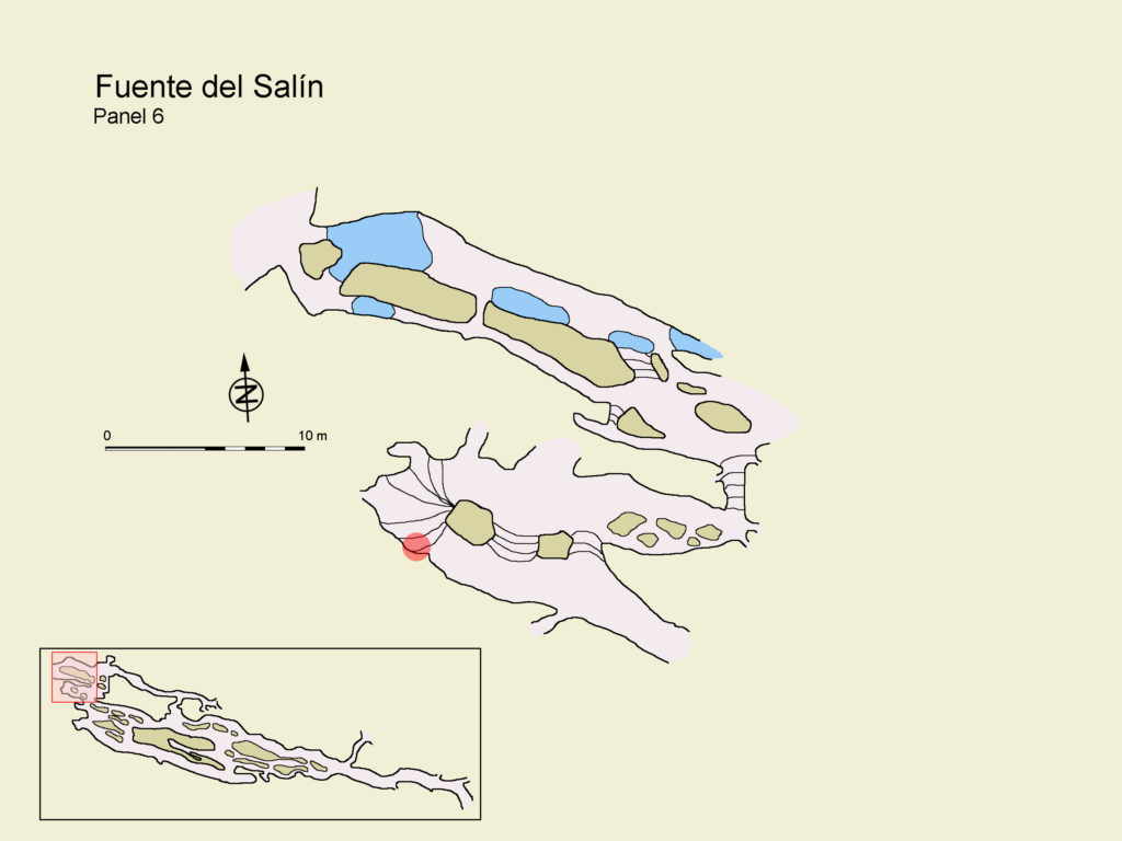El análisis espacial de las figuraciones demuestra un uso diferenciado del espacio a partir de reparticiones de temas, usos distintos de los espacios, etc. Así, mientras que la gran mayoría de las figuraciones de animales se localizan en las zonas iniciales de desarrollo de la sala, las representaciones de manos sólo aparecen desde la zona central y hacia el fondo (González-Sainz, 2003: 209-210).